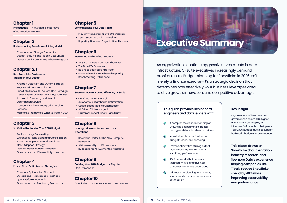 That’s why we created a new in-depth guide on how to plan your 2026 Snowflake budget with confidence. Below is a teaser of what’s inside – the key trends, blind spots, and strategic moves every data leader should know – before finalizing their numbers.