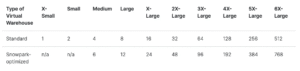 See credit map illustrating warehouse sizes, available resources per query, and corresponding credit costs.